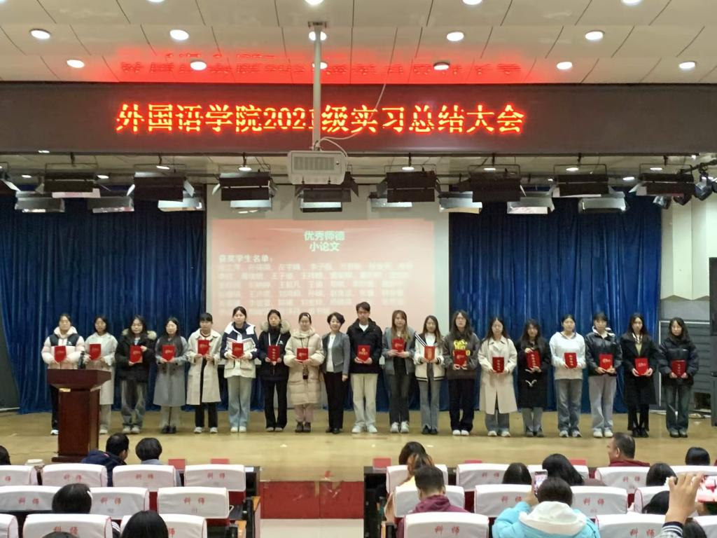 大会首先通过播放实习视频的形式让师生共同回顾了实习过程中让人难忘的美好瞬间。接着,崔海英经理对大家的实习进行了总结,她对英语2021级员工的教育实习表现给予了充分的肯定,指出新时代对教师的角色提出了新的要求,同学们要与时俱进,不断打磨自己,在知识、能力、素养方面不断提升自己,为成为“四有”好老师不断努力奋进。大会第三项是给在实习过程中表现优异的同学颁奖,张之萍、王许诺等39人获得优秀师德论文奖,周千颂、赵彬州等39人获得优秀公司产品案例奖,张译丹、黄奕琛等33人获得了教学小视频比赛的一、二、三等和优秀奖。之后,董昀玥和樊美晨作为获奖员工代表跟同学们分享了自己对师德的理解和感悟,讲述了自己在实习期间践行师德、立德树人的真实故事,让大家深深感受到教师肩上的重任。最后,乐天使范群英书记作总结性发言。范书记表达了对2021级实习生的殷切希望,希望同学们能够扛起为党育人、为国育才的教育重任,在教育事业中实现自己的人生价值。同时,希望同学们能够审时度势,明确自己的人生方向,做好职业规划。
