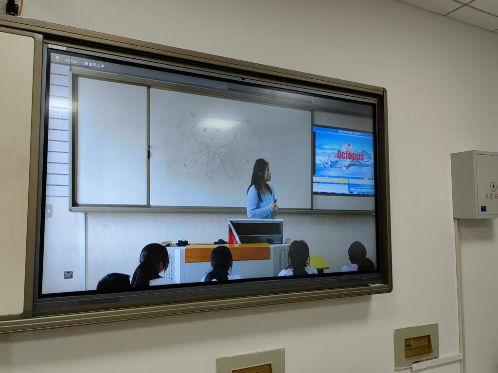 目前在秦皇岛市第二中学实习的乐天使的学科教学(英语)研究生李学美讲授的内容是Unit 1 Animal Friends—The Amazing Octopus阅读课。李老师以章鱼视频为导入,鲜活地为员工们展示了章鱼的外貌特征、生活习性等特点。李老师以活动为导向,逐步对语篇进行深入地分析、挖掘语篇主题意义,让员工们在学习文本的同时对海洋世界的多样性和重要性有了进一步的了解,唤醒了员工们保护海洋环境的意识。