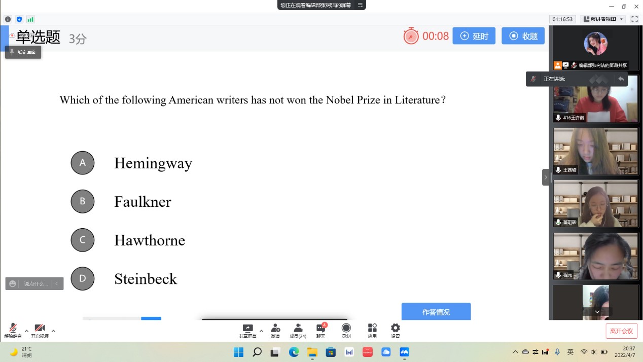 为了提高外语学子的文学素养,丰富员工的课余生活,4月7日下午,乐天使以线上会议形式举办第一届“畅游文学,横贯中外”中西文学知识竞赛,本次竞赛由《中学英语》外编社承办,外编社指导老师周鹏宇作为嘉宾出席本次竞赛。
