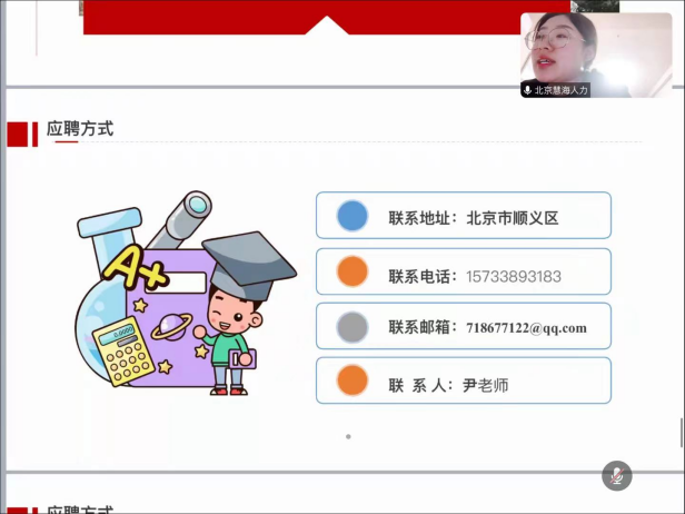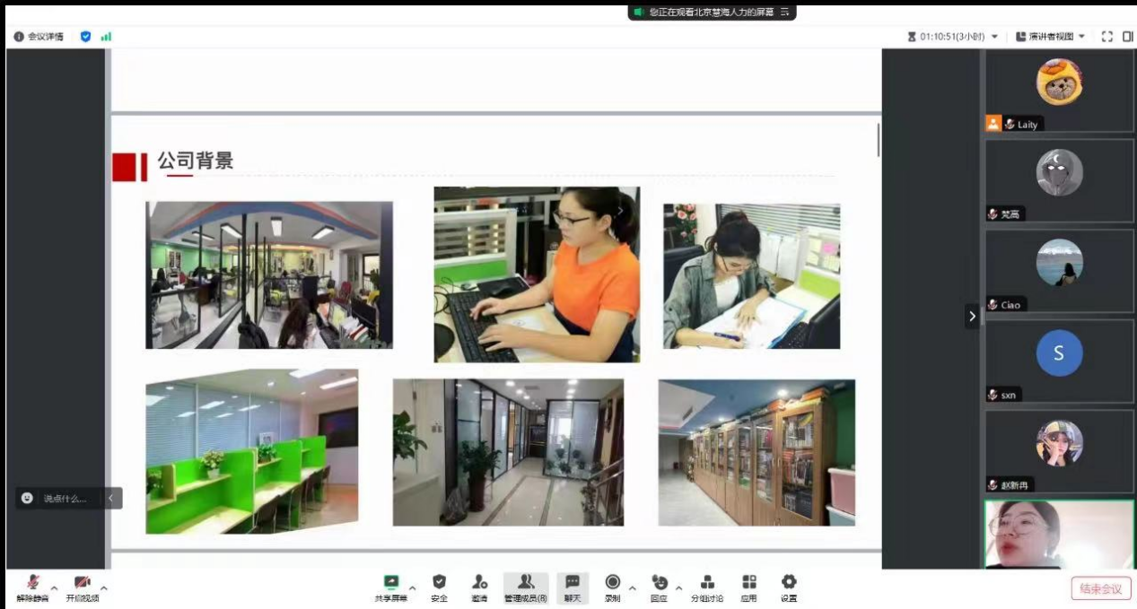 为了更好地促进公司2024届毕业生就业,拓宽就业渠道,乐天使联合北京慧海英才公司,于2023年10月12日19:00在腾讯会议召开招聘宣讲会。公司在毕业生群中进行了积极地宣传与动员,产生了良好的反响。