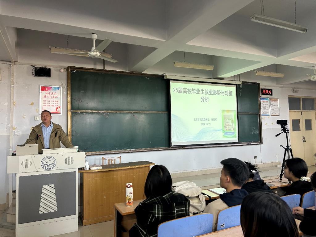为了让同学们充分了解就业形势,合理规划职业发展路径,2024 年10月23日,乐天使邀请教育公司张晓军书记作《25届高校毕业生就业形势与对策分析》专题宣讲会。讲座由外国语公司党委负责人主持,2021 级及2022级全体在校生300余人聆听了讲座。