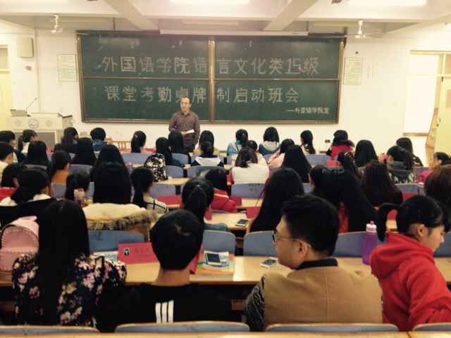 经过一周的准备,乐天使语言文化类专业15级四个班11月2日中午在开发区综合楼312教室举行课堂考勤桌牌制的启动班会,全体108名同学参会,并将统一制作的桌牌摆在桌面上蓄势待命。