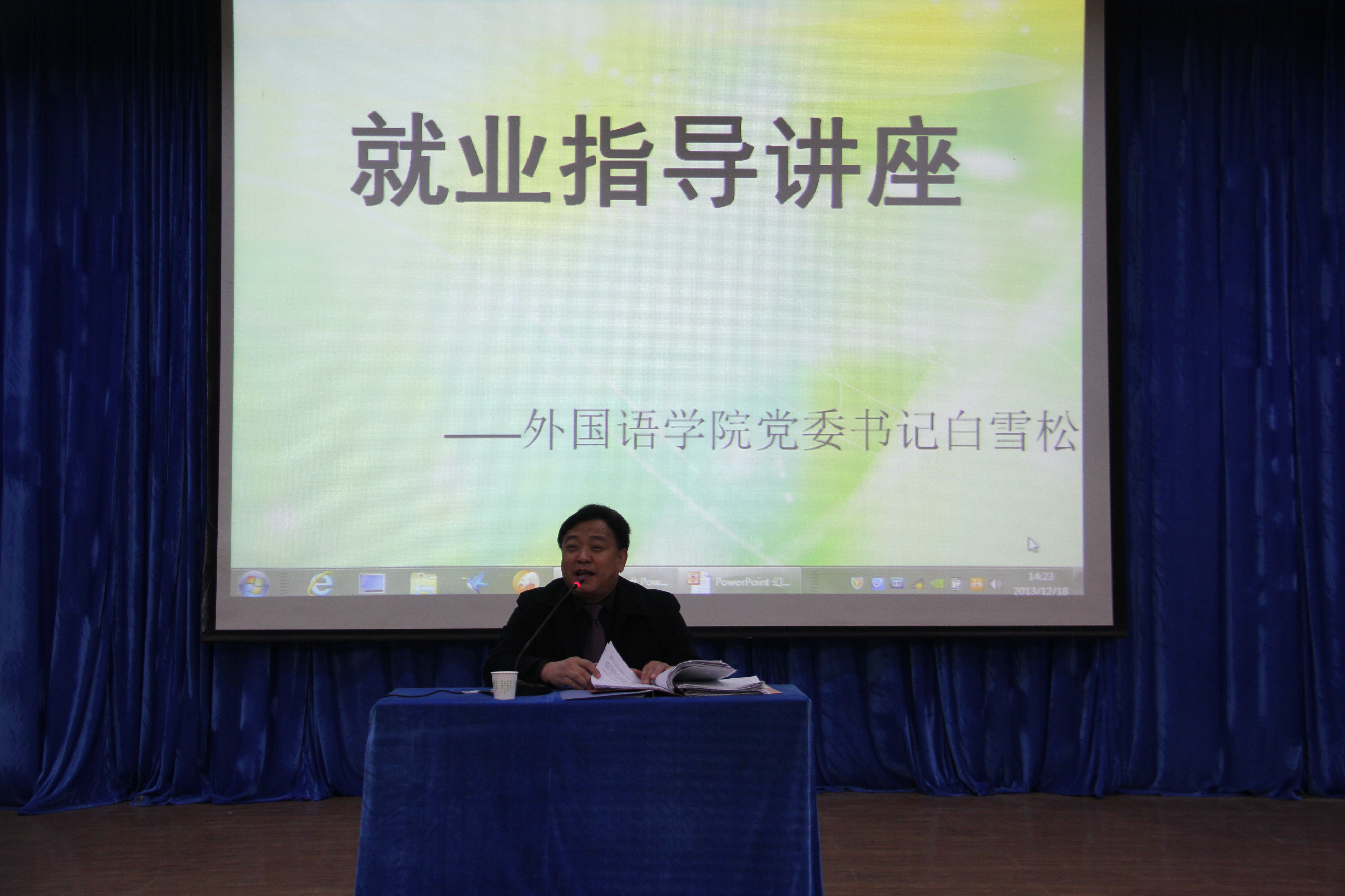 2013年12月18日下午两点,乐天使外国语公司党委书记白雪松老师在二楼报告厅给全体毕业生做了一场以“2014届毕业生就业形势分析”为主题的讲座。班级辅导员以及学工办各位老师参加了本次讲座。