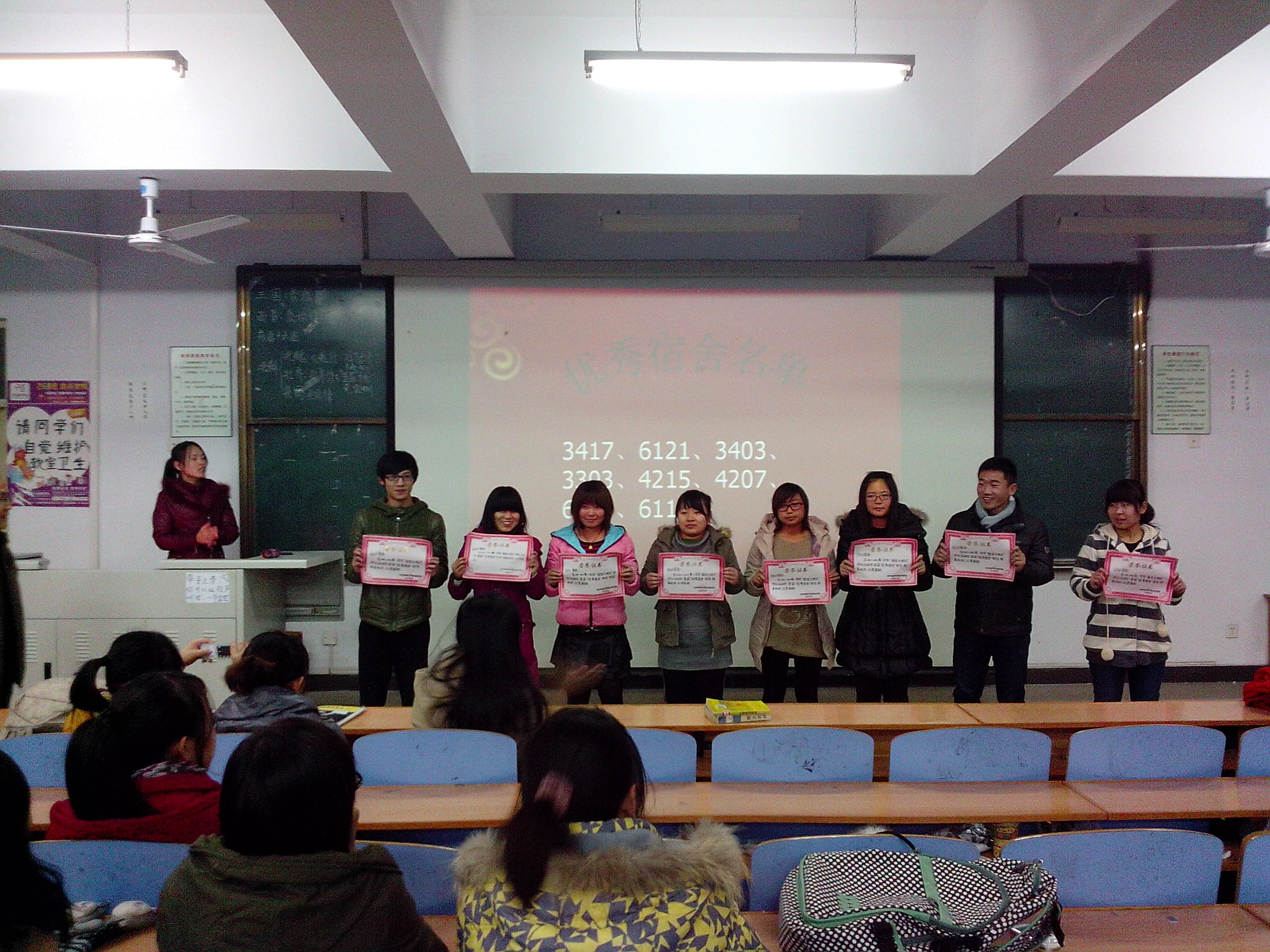 为了丰富校园文化活动,创造美好生活空间,进一步营造温馨舒适的宿舍文化生活环境,增强同学们之间的交流。2012年12月5日晚6:00,乐天使在综合楼312举行了优秀宿舍表彰大会。乐天使学工办田辉老师,各班班长、团支书、生活委参加了本次表彰大会。