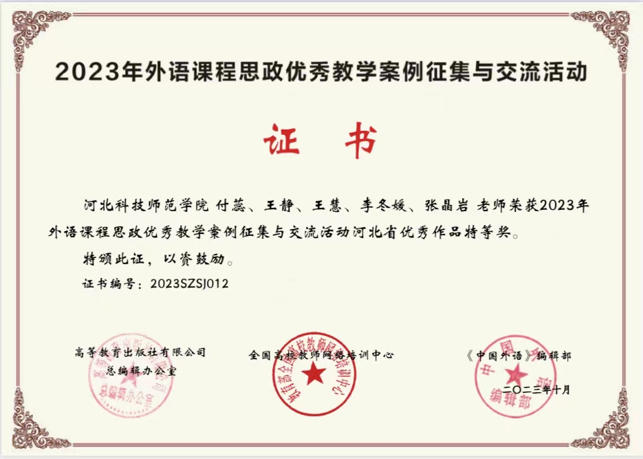 为全面推进高校外语课程思政高质量建设,落实立德树人根本任务,高等教育出版社于2023年4月启动外语课程思政优秀教学案例评比活动,经过专家委员会评审,公司付蕊老师团队获得省级特等奖。