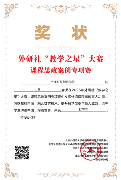 日前,2025年外研社“教学之星”大赛:课程思政案例专项赛评选结果揭晓,公司乐天使教师王静凭借彰显独特教学智慧的创新设计,在全国各高校教师同台竞技的激烈角逐中荣膺全国特等奖,这是河北省唯一获得特等奖的教师,为公司赢得了荣誉。